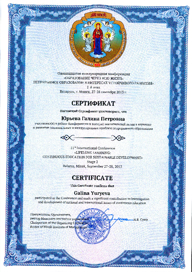 27-28 сентября 2013 года в Минске, Беларусь состоялся 2-й этап одиннадцатой международной конференции «ОБРАЗОВАНИЕ ЧЕРЕЗ ВСЮ ЖИЗНЬ: НЕПРЕРЫВНОЕ ОБРАЗОВАНИЕ В ИНТЕРЕСАХ УСТОЙЧИВОГО РАЗВИТИЯ». Директор Центра среднего и дополнительного профессионального образования, кандидат педагогических наук, доцент кафедры общей и профессиональной педагогики филиала Кубанского государственного университета в г. Славянске-на-Кубани Юрьева Галина Петровна приняла участие в работе секционного заседания «Непрерывное образование как условие и фактор формирования профессионализма и компетентности. Образовательные методики и технологии» с докладом «Формирование управленческой компетенции руководителя образовательной организации в системе непрерывного образования».