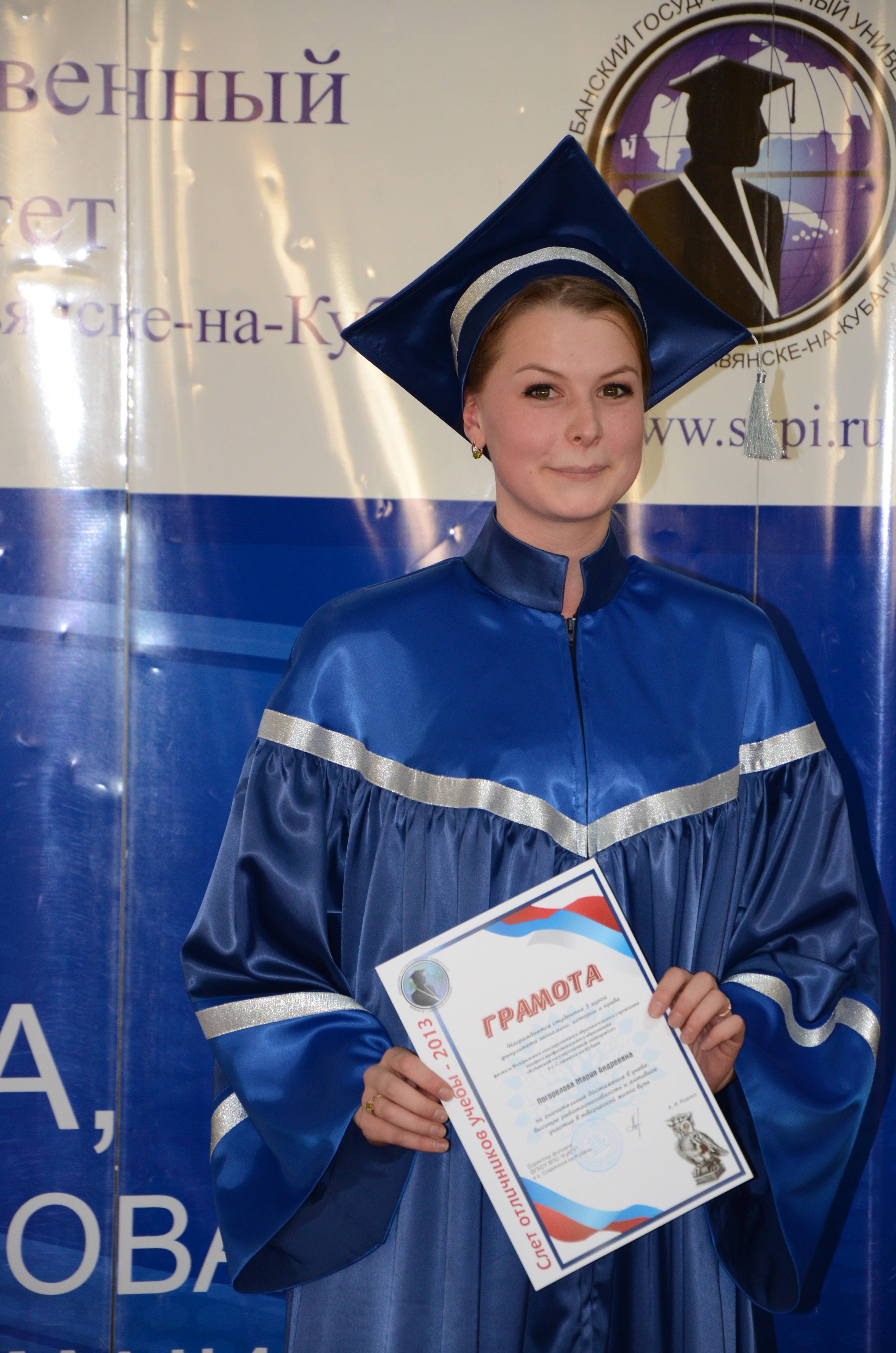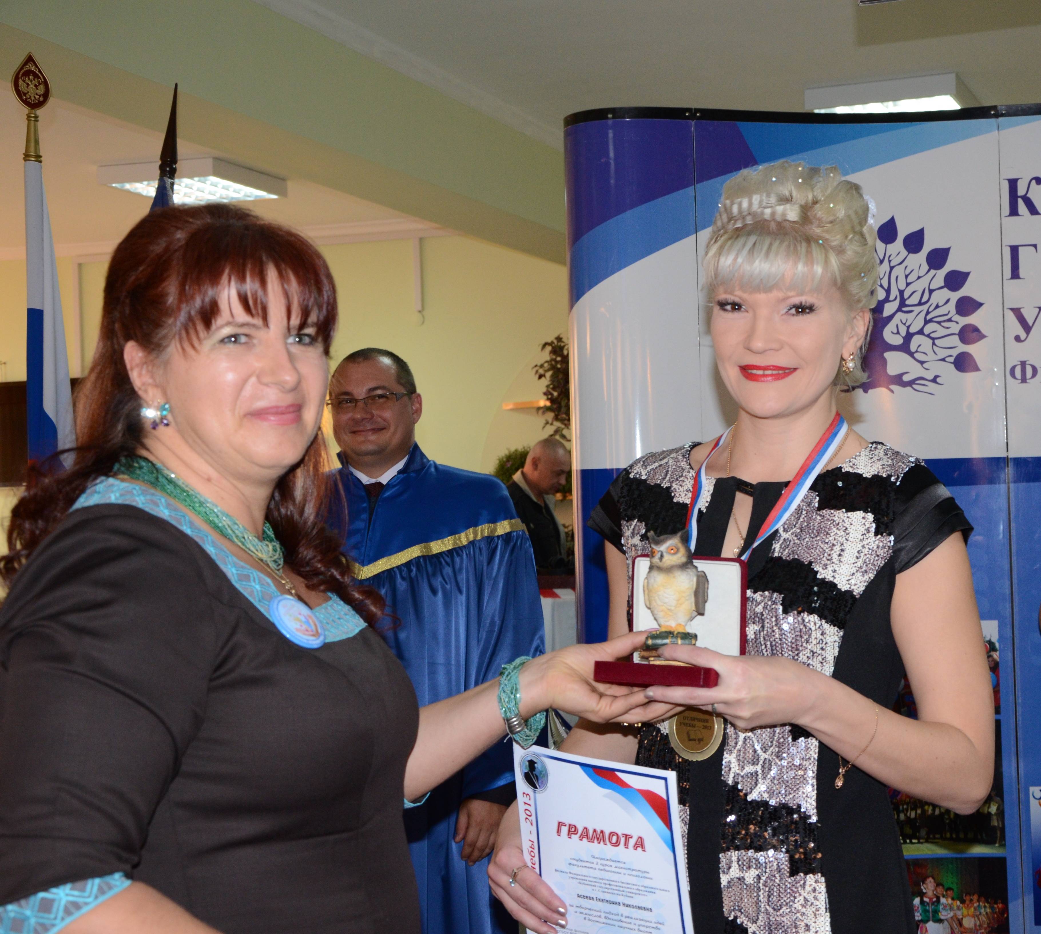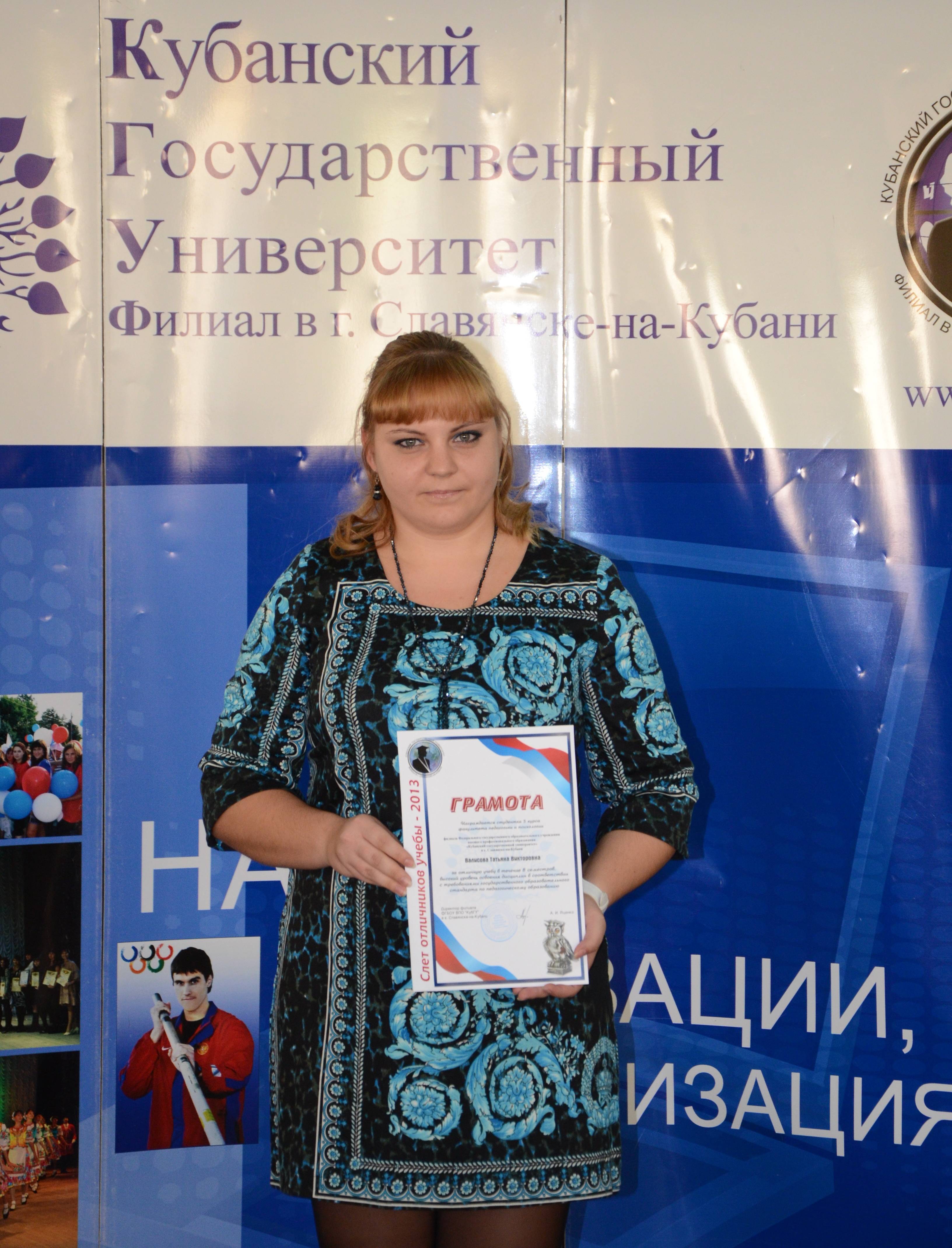 В номинации за достижения в учебной деятельности грамотой, именной медалью и статуэткой, обозначающей мудрость, трудолюбие и упорство была награждена студентка 5 курса факультета педагогики и психологии Валисова Татьяна Викторовна. На протяжении 8 семестров из 8 обучается на отлично, 29 дисциплин из 29 сдано на отлично, из них по рейтингу успеваемости имеет 100-бальный результат по 18 дисциплинам. За весь период обучения студентка была отмечена 4-мя похвальными грамотами за высокие достижения в учебе. Татьяна Викторовна победитель конкурса-2012 и 2013 года на получение повышенной государственной академической стипендии. Особый интерес у студентки вызывают изучение дисциплин психотерапия и психологическое консультирование, что стало стимулом в получении дополнительного образования по программе «Психотерапия и психологическое консультирование». По итогам педагогических практик в летнем оздоровительном лагере «Кавказ» и в СОШ № 18 г. Славянска-на-Кубани награждена грамотами за участие в делах школы и оказание помощи в организации мероприятий, посвященных открытию летней оздоровительной кампании «Лето - 2013». Студентка на протяжении всех лет обучения показывает высокий уровень учебных достижений, что проявляется в творческом выполнении учебных заданий улучшая свои знания, наличием собственного авторского взгляда и принятии нестандартных решений в условиях группового взаимодействия.