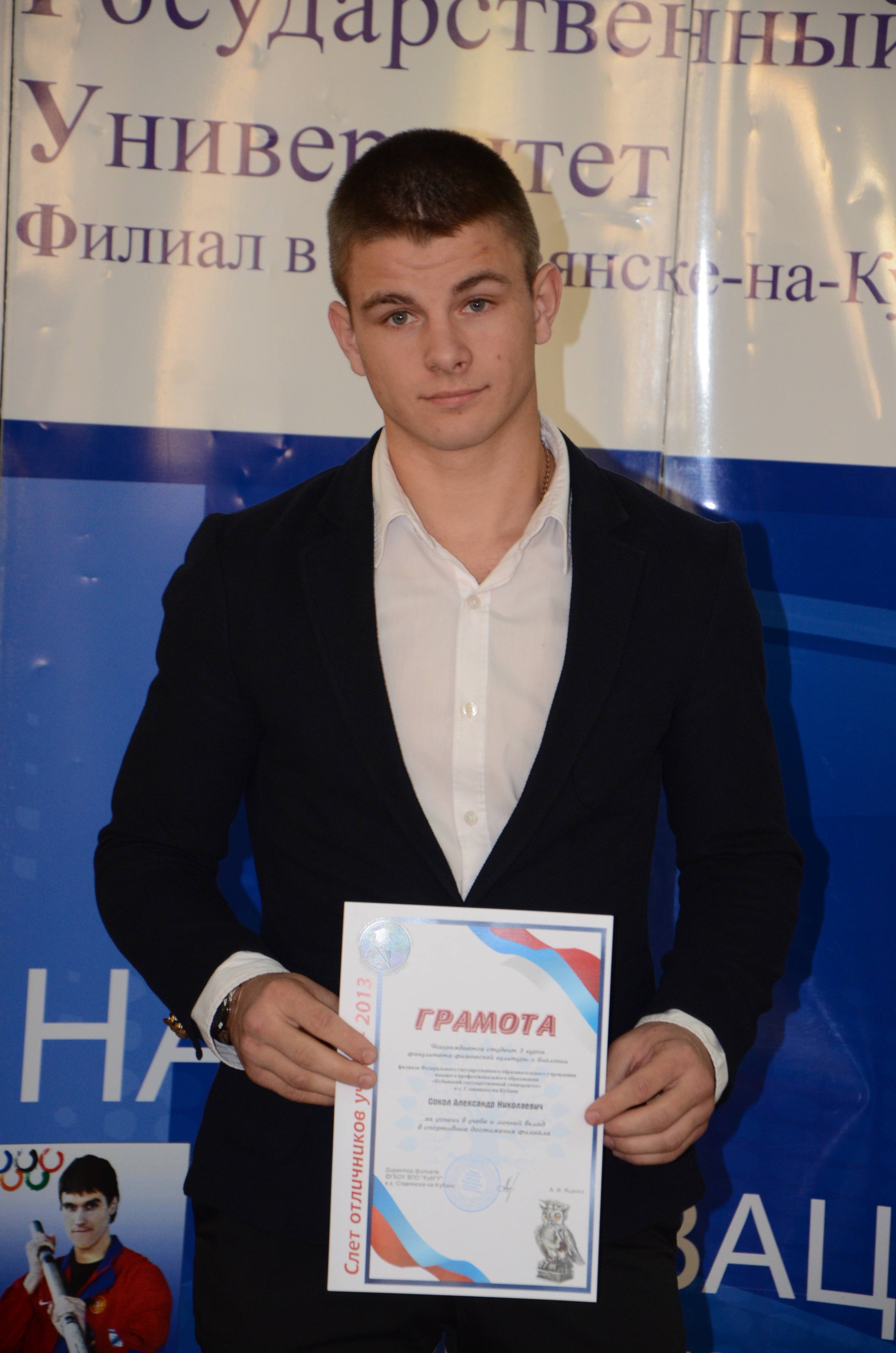 За достижения в спортивной деятельности администрацией филиала был выделен студент 3 курса факультета физической культуры и биологии Сокол Александр Николаевич. Кандидат в мастера спорта по боксу. Победитель международного матча среди сборных команд «Куба — Россия». Член сборной Южного федерального округа. Чемпион Краснодарского края среди молодежи. Серебряный призер первенства Южного федерального округа, серебряный призер первенства России, двукратный серебряный призер Универсиады Кубани по боксу. На протяжении последних лет входит в десятку лучших спортсменов нашего города и Краснодарского края.