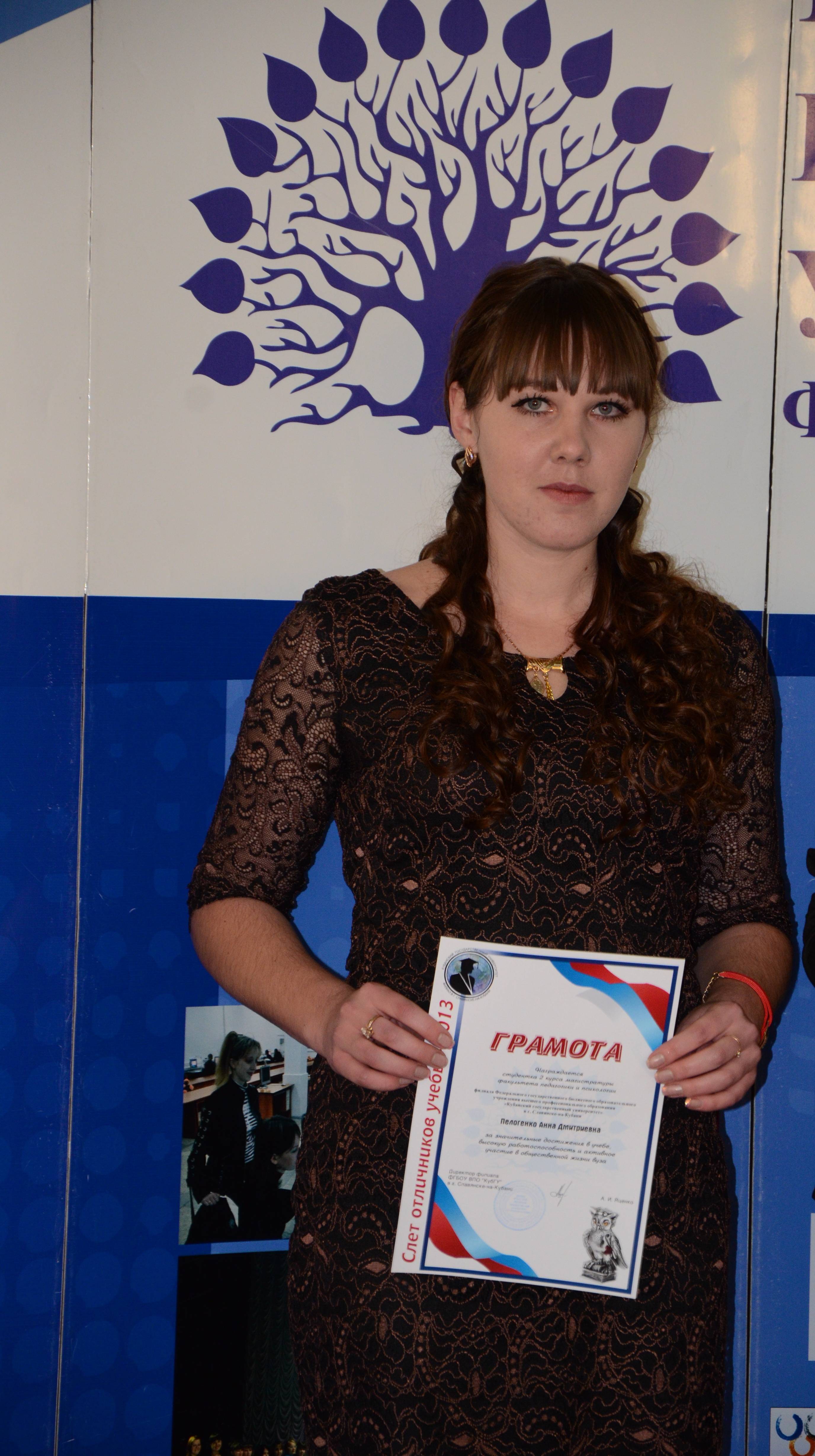 Лучшей в номинации за достижения в общественной деятельности стала студентка магистратуры 2 курса по программе «Управление образовательной организацией» Пелогенко Анна Дмитриевна. Выпускница факультета педагогики и психологии 2012 года. Председатель молодежной студенческой организации "МОСТ". Член молодежного Совета при главе Славянского района. Организатор ежегодных программ: «Форум прогрессивной молодежи», «Дебют первокурсников», «Лидер XXI века», «И помнит мир спасенный». Отмечена 18-ю грамотами и благодарностями за проявленные организаторские и лидерские качества, успешную волонтерскую деятельность, активное участие в избирательных кампаниях и в акциях на территории Муниципального образования Славянский район.