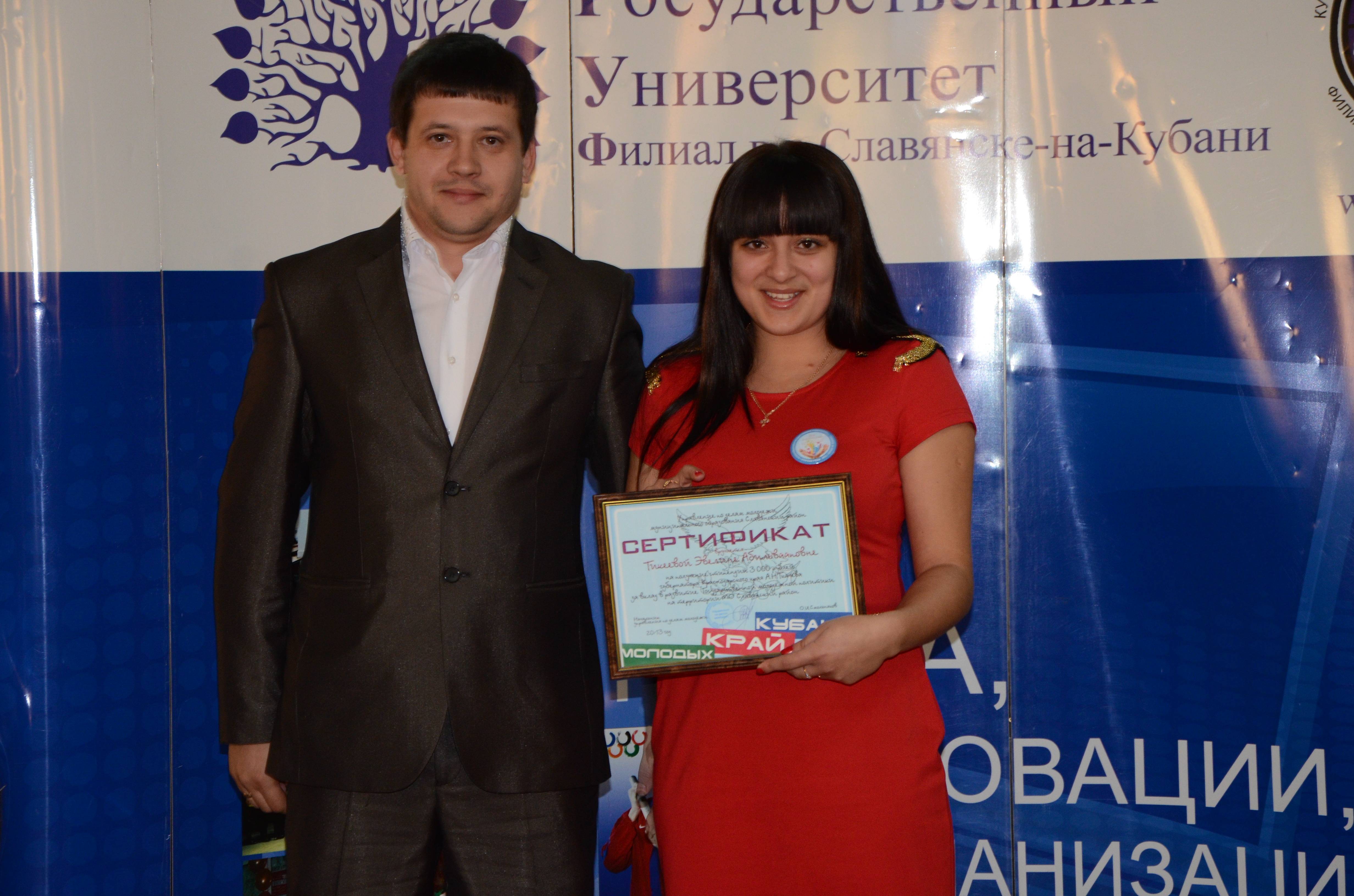 В преддверии нашего Слета отличников учебы, были подведены итоги конкурса «О присуждении специальной молодежной стипендии администрации Краснодарского края, победителем которого была определена Тикеева Эвелина Абильвааловна студентка 3 курса факультета педагогики и психологии. Председатель студенческого самоуправления факультета. Член молодежного Совета при главе Славянского района. Заняла первое место в конкурсе «Портфолио общественных достижений студента». Отмечена благодарственным письмом за активное участие в проведении новогодних утренников для дошкольников Детского сада № 18 города Крымска, грамотой за ответственное отношение к подрастающему поколению и активное участие в жизни детского лагеря «Планета Почемучек» Лицея №1 города Славянска-на-Кубани. Является организатором всех мероприятий факультета. Награждена 32-мя грамотами и благодарственными письмами вузовского, муниципального и краевого уровней.