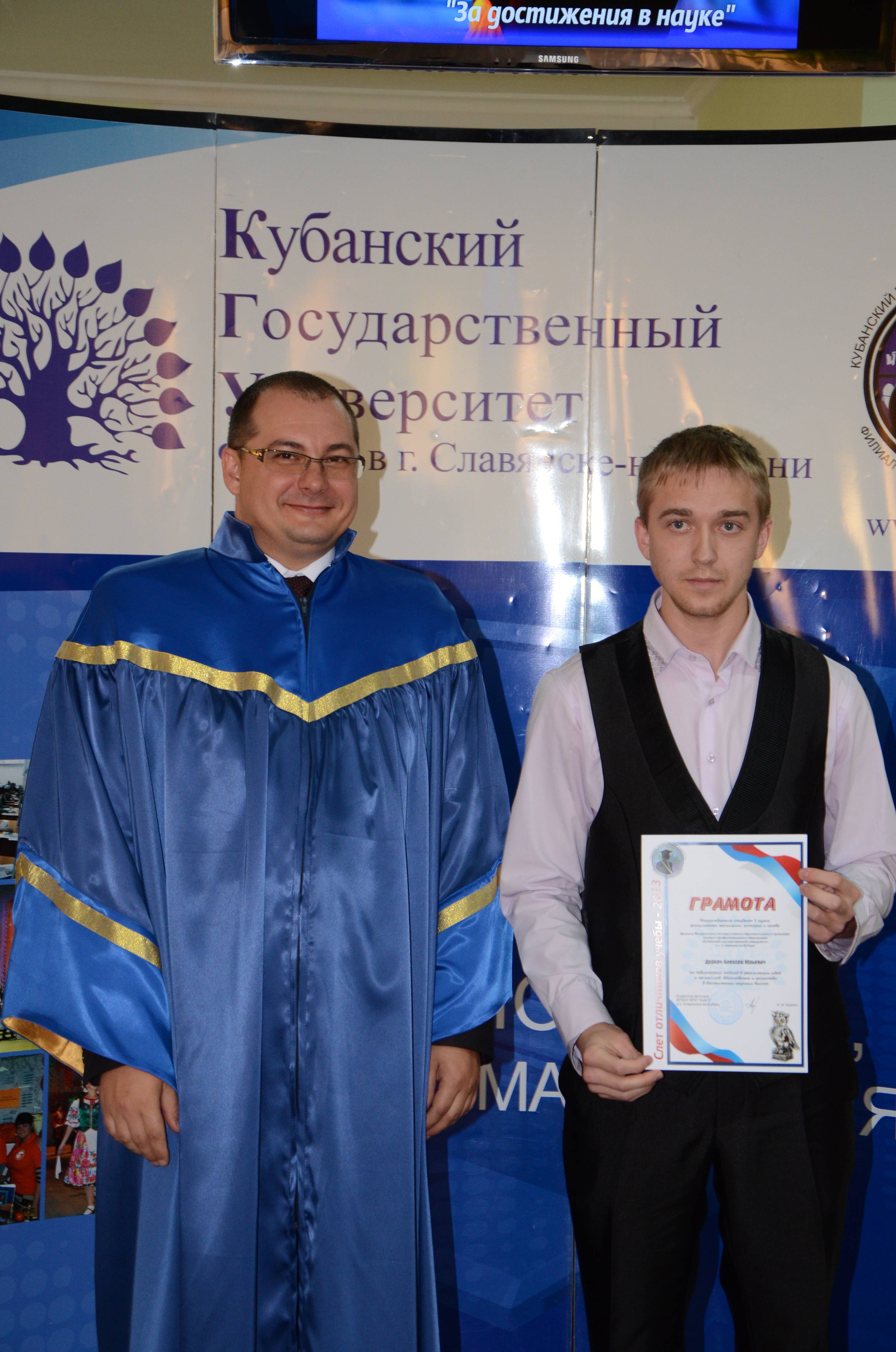 В рамках празднования международного дня студентов в нашем филиале 15 ноября состоялось ежегодное традиционное мероприятие «Слет отличников». В этом году в празднике приняло участие 144 учащихся бакалавриата, специалитета, магистратуры и аспирантуры. Приглашенными гостями были - Литовка Г.В. (председатель Совета М.О. Славянский район), Черных Т.А. (и.о. начальника управления образованием М.О. Славянский район, выпускник вуза 2010 года), Смольняков О.И. (начальник управления по делам молодежи М.О. Славянский район, выпускник вуза 2007 г.), Гребенникова В.М. (д.пед.н, декан факультета педагогики, психологии и коммуникативистики КубГУ), Дмитриев Е.В. (к.п.н, директор ГБОУ ССО «Славянского сельскохозяйственного техникума»), Бадья В.Г. (выпускник магистратуры 2013 года, волейболист, бронзовый призер Универсиады КубГУ, член сборной КубГУ), Дениева О.А. (выпускница вуза 2009 г., солистка муниципального народного хореографического ансамбля «Ритмы планеты», руководитель детских хореографических коллективов «Радость» и «Аистенок» ГДК), Иорданян Т.М. (генеральный директор сети отелей «Уют»), Литвиненко Д.М. (управляющий парк-отель «Уют»).