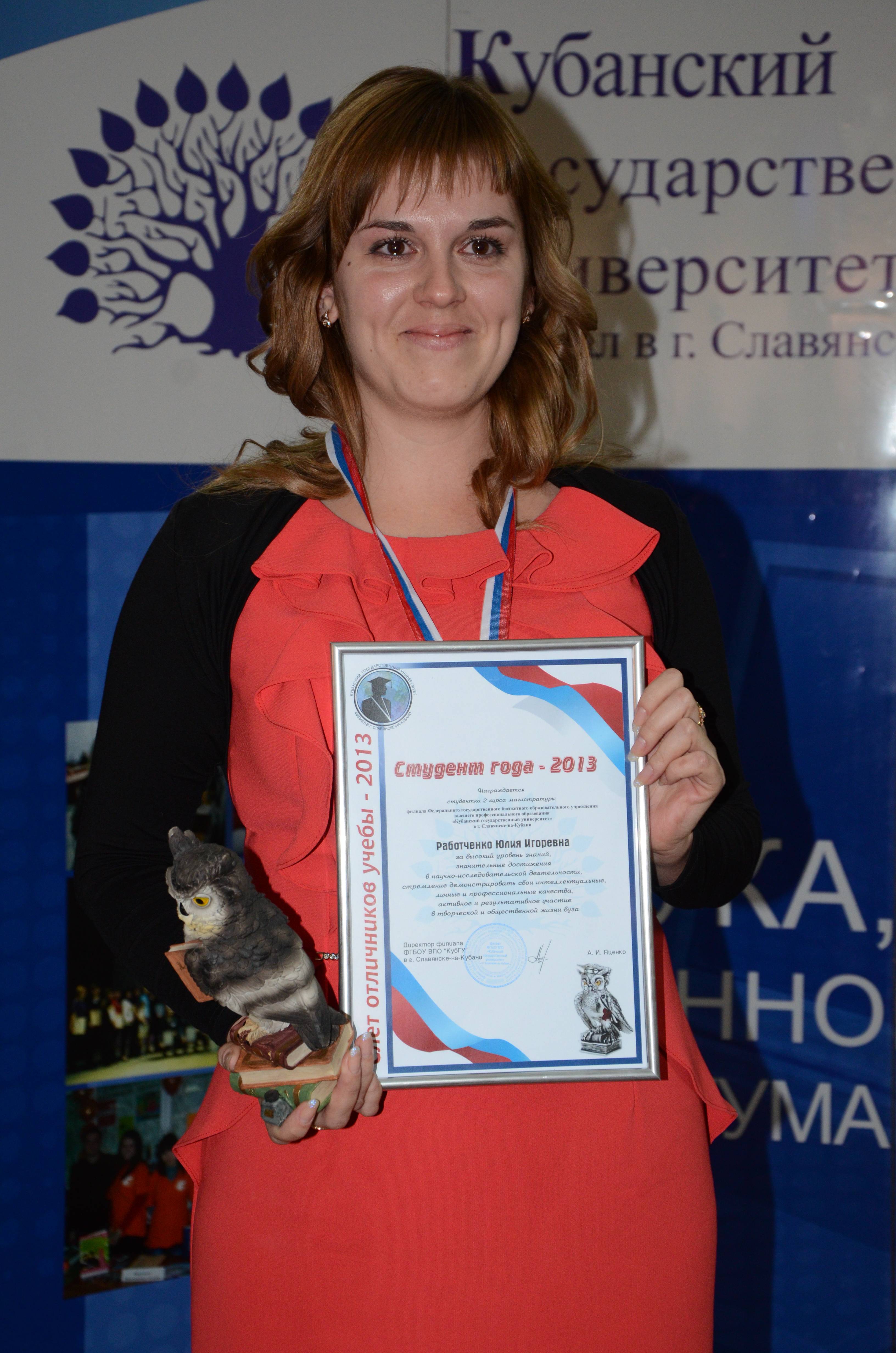 В заключении первой части чествования отличников было названо имя студента, которому будет присвоено наивысшее звание в номинации «Студент года – 2013». Студенты, претендующие на это высокое звание, совместили все: творческий талант, общественную деятельность, спорт, науку. В этой номинации победителем была определена студентка 2 курса магистратуры Работченко Юлия Игоревна. Выпускница факультета педагогики и психологии 2012 года. Приняла участи в IX Международной заочной научно-практической конференции «Модернизация российского образования: проблемы и перспективы», награждена сертификатом участника и опубликована статья. Дипломант 3 степени и обладатель кубка II открытого конкурса работ студентов, молодых ученых и специалистов психологов и психотерапевтов Юга Российской Федерации, проводимого в рамках III Съезда психотерапевтов, практических психологов и психологов-консультантов ЮФО РФ. Ежегодно принимает участие во Всероссийской научно-практической конференции с международным участием «Психолого-педагогические исследования качества образования в условиях инновационной деятельности образовательного учреждения» по итогам которых имеет публикации. В рамках проведения Дней науки в филиале КубГУ награждена грамотой за 1-е место в конкурсе «Лучшая научная и творческая работа студентов, (магистрантов), аспирантов и соискателей филиала КубГУ в г. Славянске-на-Кубани». Автор 4х научно-исследовательских работ международного и всероссийского уровней. В течение всего периода обучения в вузе организатор различных мероприятий на факультете и в филиале.