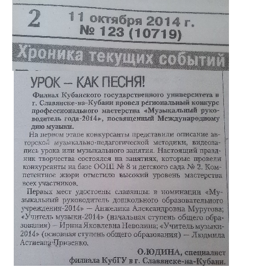 в номинации «Учитель музыки – 2014» (начальная ступень общего образования) - - I место — Неволина Ирина Яковлевна — Славянский район, II место Диденко Ирина Александровна — Курганинский район;