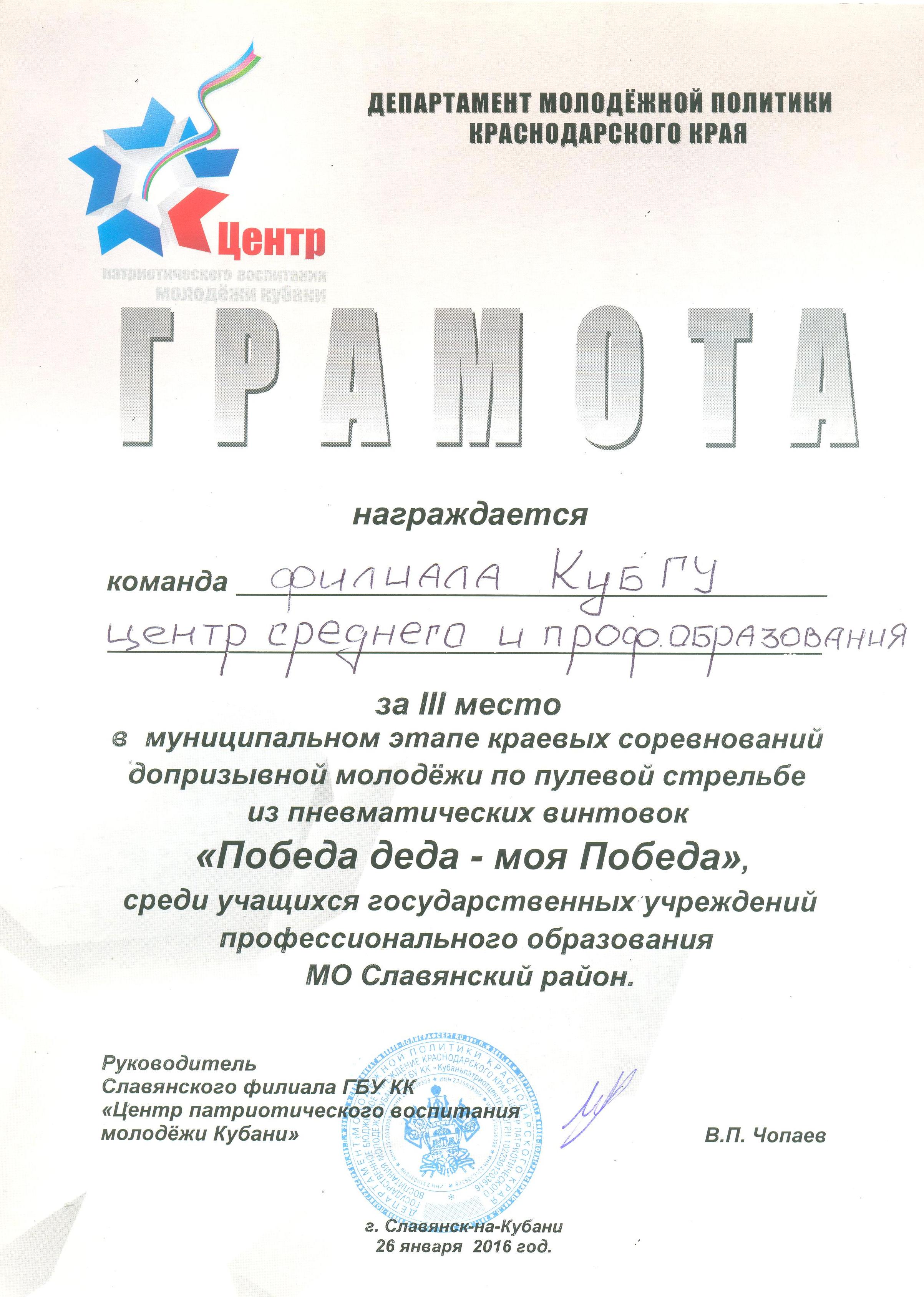 26 января в рамках месячника оборонно-массовой и военно-патриотической работы прошли соревнования по пулевой стрельбе из пневматической винтовки. В соревнованиях приняли участие студенты второго курса Арустумян Арсен, Архангельский Дмитрий, Кеба Павел, Кобзарь Никита, Тененеко Александр, Буйновский Алексей, Мальцев Иван, Савенко Петр, Забоев Игорь, также отличились наши девушки Редько Виолетта и Тимченко Диана. В тяжелой борьбе команда студентов Кубанского государственного университета, обучающихся по программам среднего профессионального образования в г. Славянске-на-Кубани заняла третье место. Поздравляем наших студентов с победой и желаем им успехов в учебе и спорте.