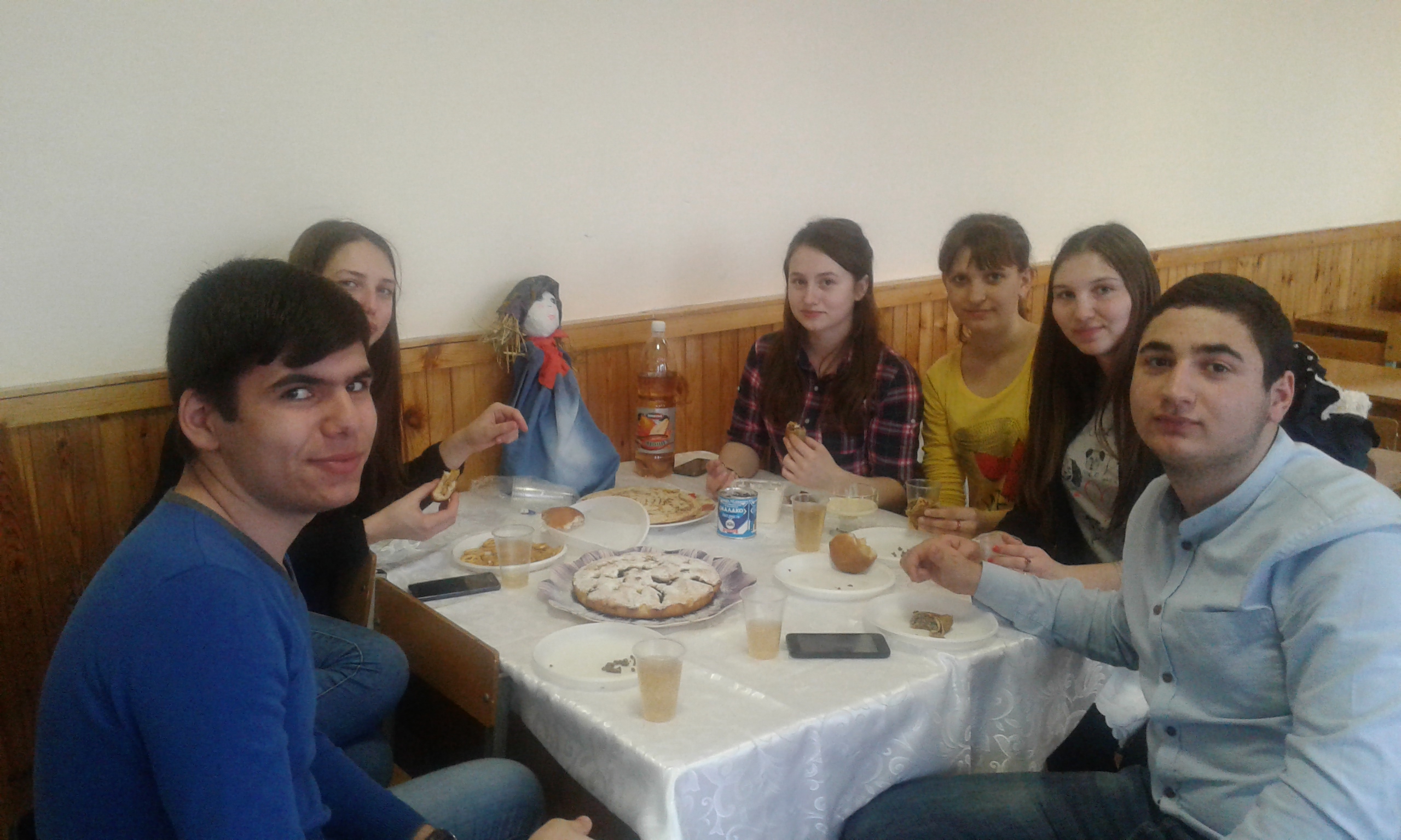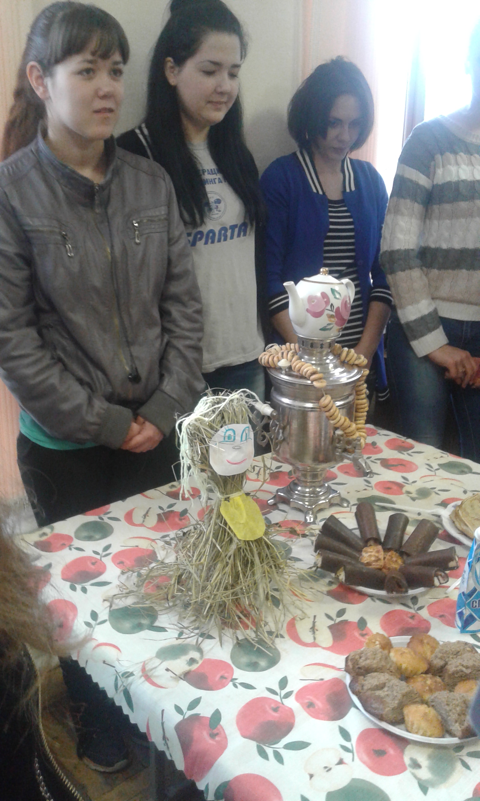 Особенно порадовали участников мероприятия студентки первого курса группы "Дошкольное образование", кроме замечательного стола они подготовили и пропели частушки. После представления стола и "чучела" жюри началось настоящее чаепитие, ребята делились вкусностями и радовались приходу весны.