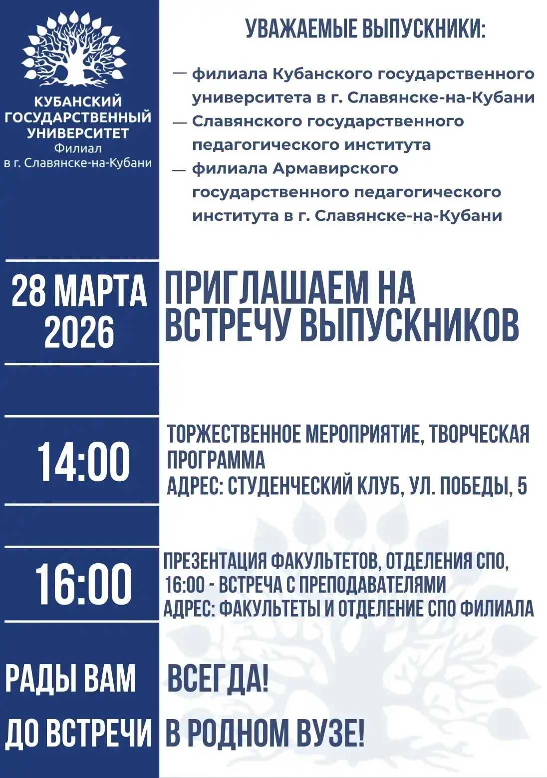 – филиала Кубанского государсвтенного университета в г. Славянске-на-Кубани Приглашаем вас на встречу выпускников, которая состоится 28 марта 2026 года по адресу: Студенческий клуб, ул. Победы, 5. 14.00 Торжественное мероприятие, творческая программа 16.00 Презентация факультетов, отделения СПО |