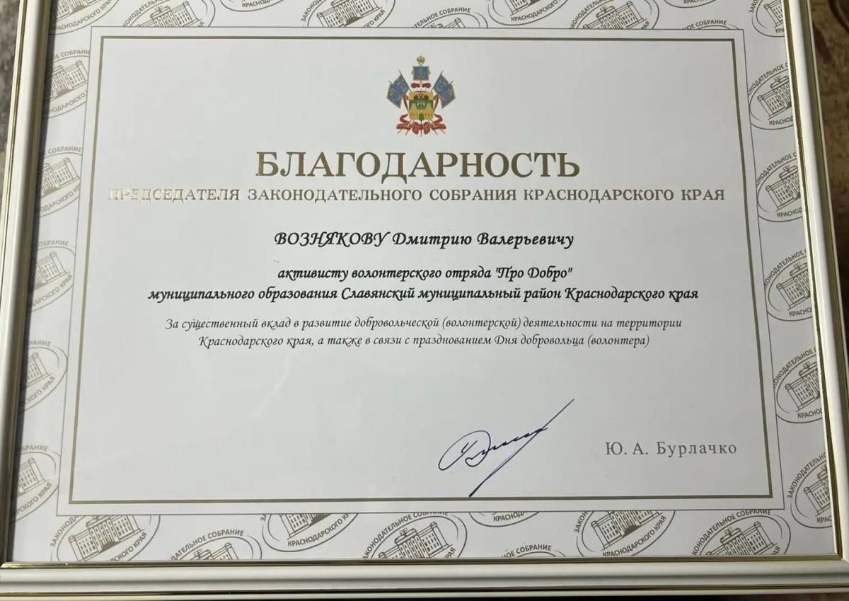 Среди награжденных – студент 5 курса факультета филологии, истории и обществознания Дмитрий Возняков. Он удостоен Благодарности Председателя Законодательного Собрания Краснодарского края Ю.А. Бурлачко «За существенный вклад в развитие добровольческой (волонтерской) деятельности на территории Краснодарского края».