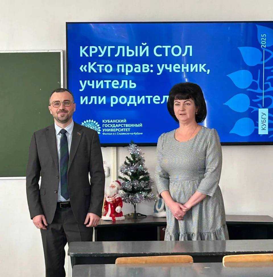 С 9 по 27 декабря 2025 года в филиале Кубанского государственного университета в г. Славянске-на-Кубани прошел цикл мероприятий в формате «Круглого стола», инициированный директором филиала, кандидатом педагогических наук Ольгой Викторовной Леус. Основной темой обсуждений стал актуальный и наболевший для большинства образовательных учреждений вопрос: «Кто прав: ученик, учитель или родители?».