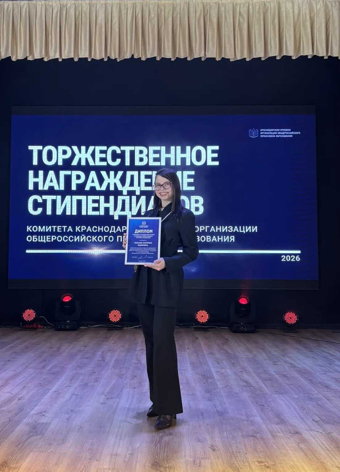 28 января 2026 года в Краевом Доме работников образования состоялась торжественная церемония награждения стипендиатов из числа профсоюзного актива. В этом году обладателями профсоюзных стипендий стали 104 обучающихся – 34 студента вузов и 70 студентов колледжей и техникумов Кубани. Все они являются председателями профбюро факультетов и институтов, профоргами отделений и групп, членами комиссий первичных профорганизаций.