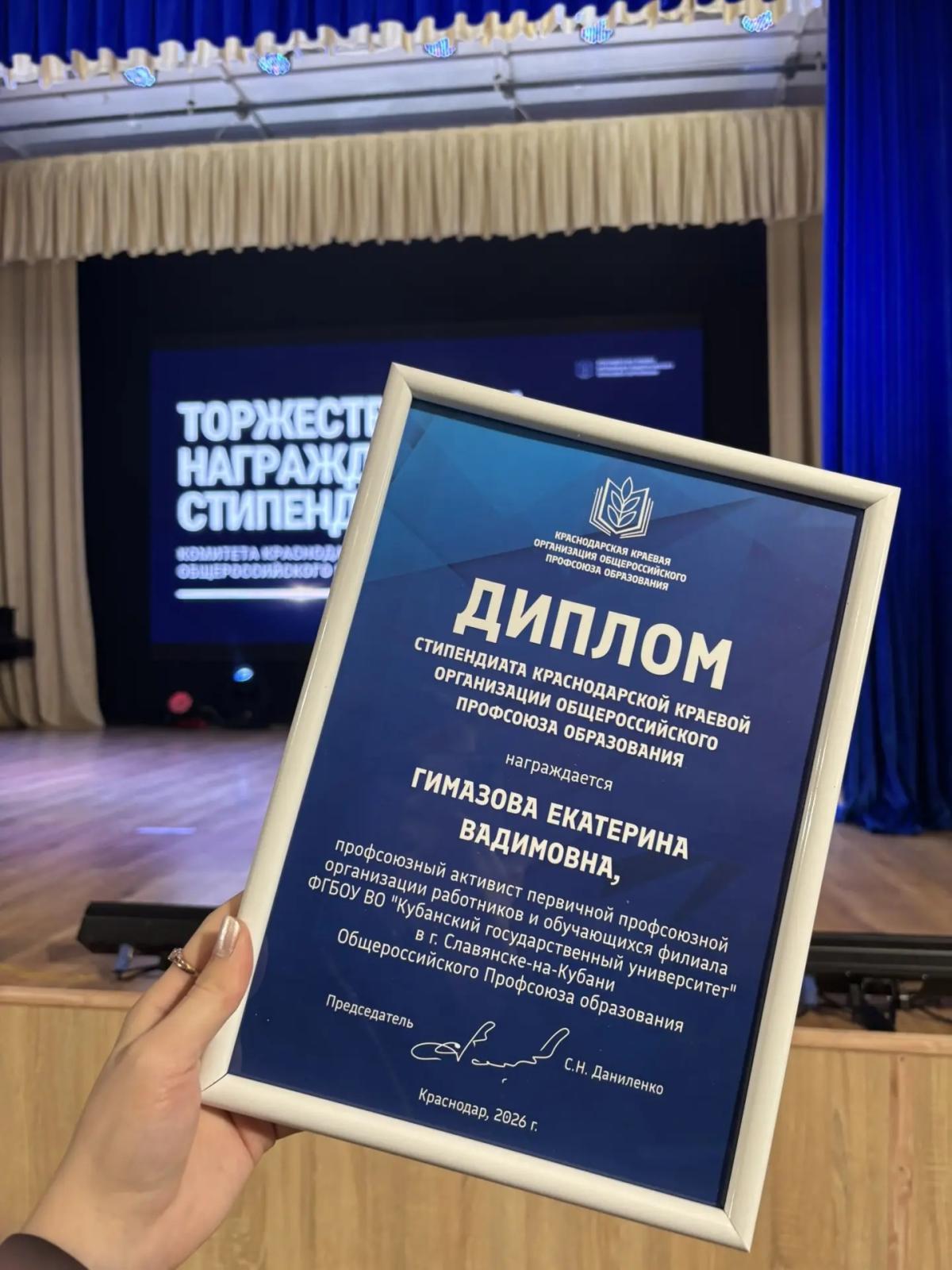 В филиале Кубанского государственного университета в г. Славянске-на-Кубани обладательницами именной стипендией Комитета Краснодарской краевой организации Профессионального союза работников народного образования и науки РФ стали студентки факультета филологии, истории и обществознания Екатерина Гимазова (2 курс) и Анна Киселева (4 курс).