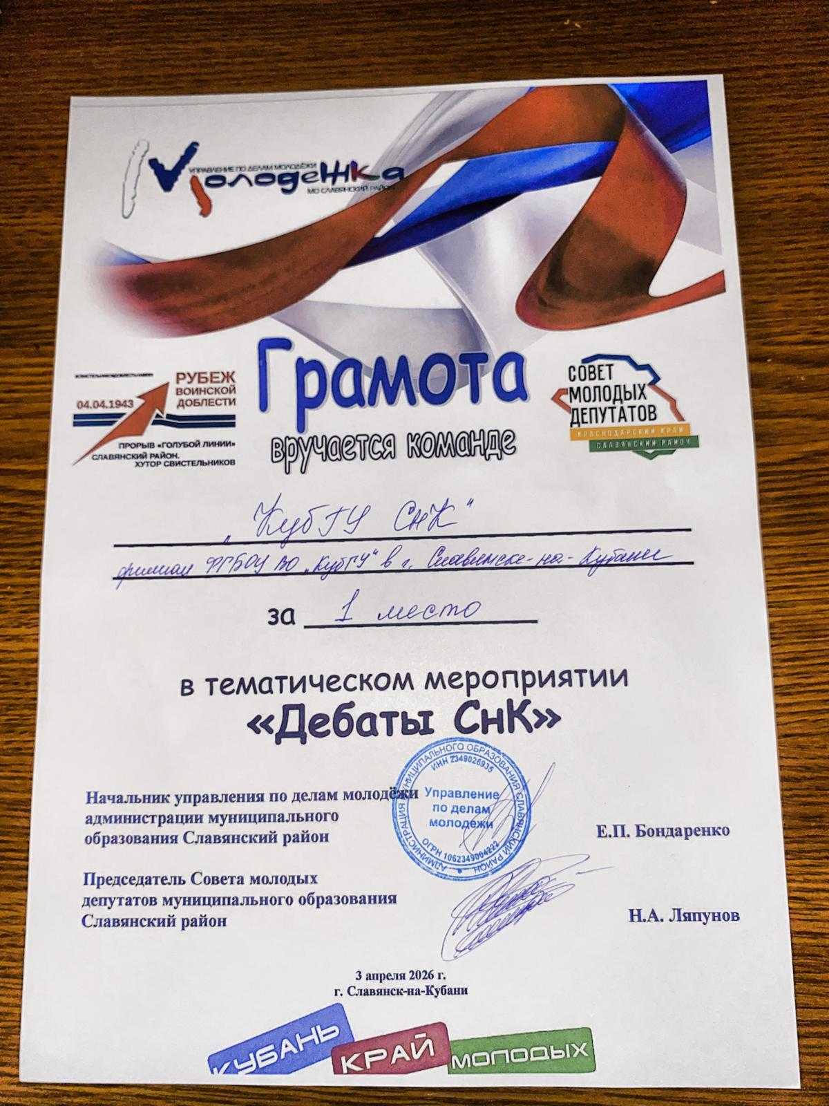 3 апреля 2026 года в стенах Дома молодежи города Славянска-на-Кубани состоялась тематическая игра «Дебаты СнК», в которой команда нашего филиала блестяще проявила себя, заняв почетное первое место!