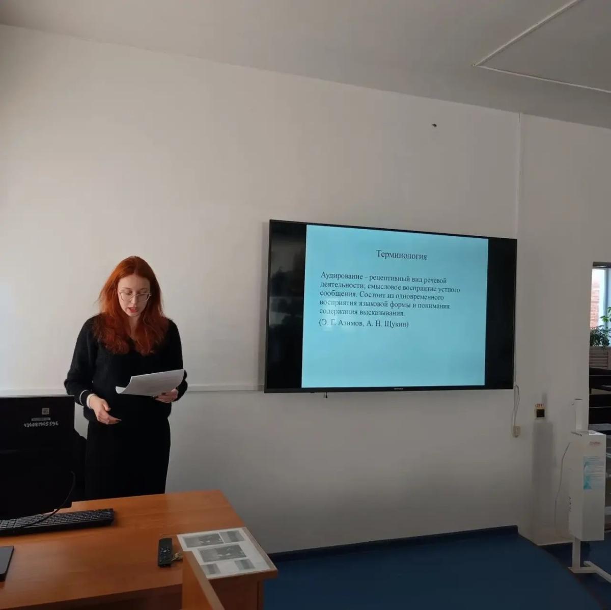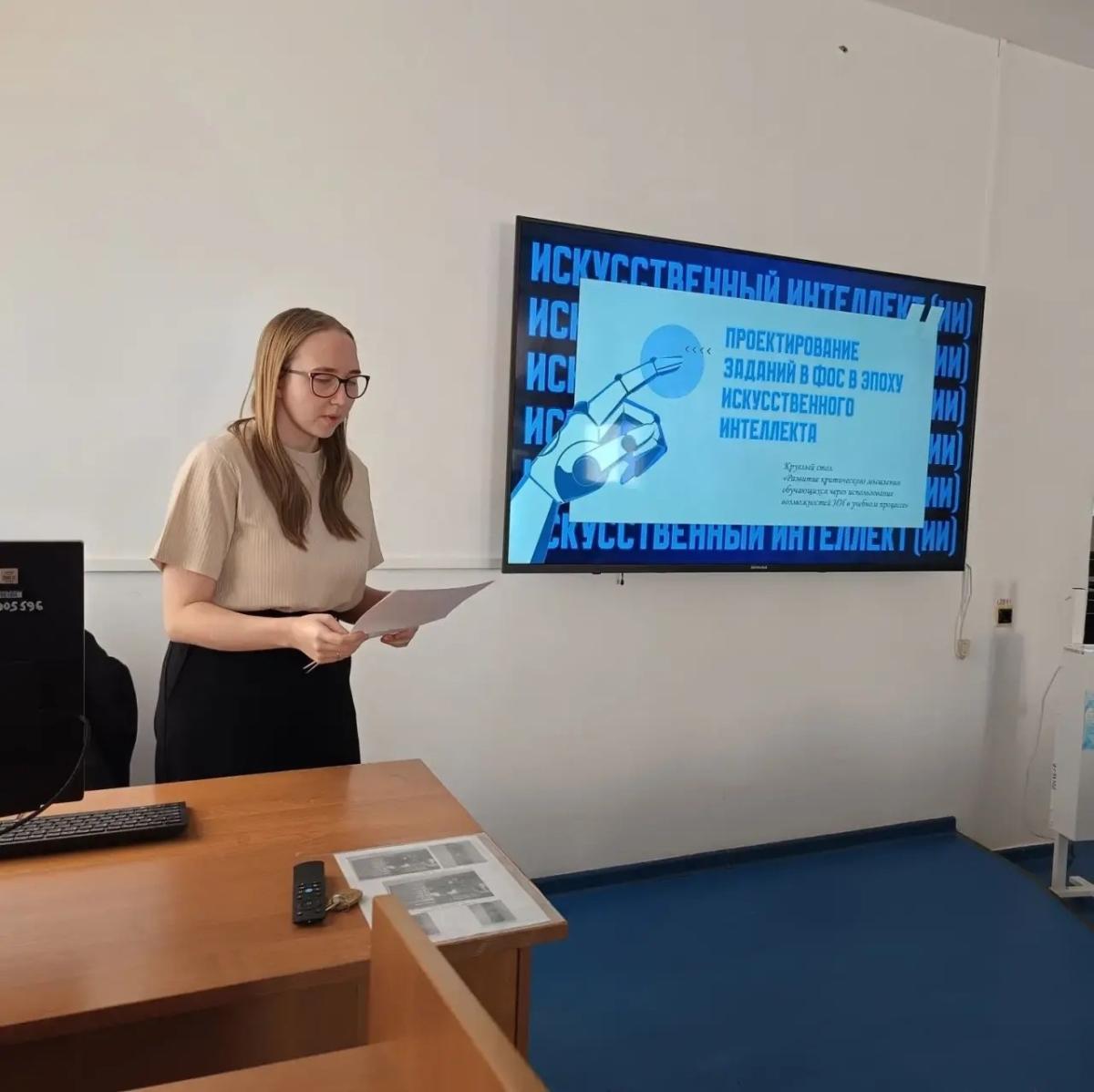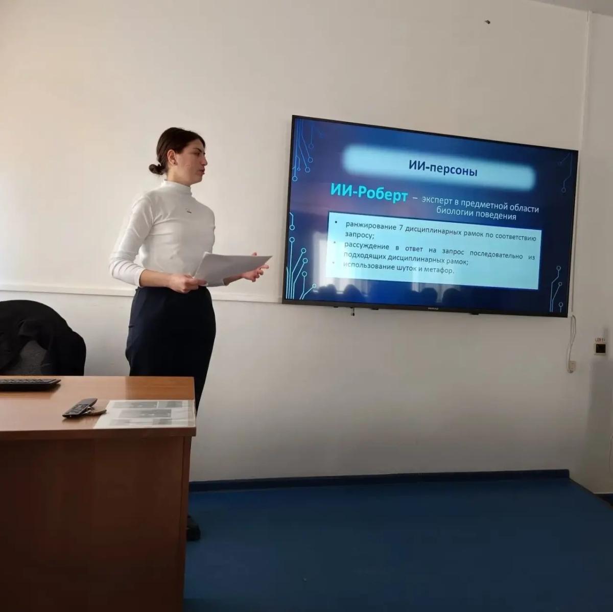 Круть Софья, студентка 4 курса, выступила с темой «Использование нейросетей для развития критического мышления пятиклассников при обучении аудированию на английском языке». Докладчик представила практические приемы адаптации ИИ-инструментов для работы с младшими подростками, акцентируя внимание на развитии навыков анализа и отбора информации. Студентка выпускного курса Баклаженко Анна в докладе «Проектирование заданий ФОС в эпоху искусственного интеллекта» подняла важный вопрос трансформации фондов оценочных средств. Анна предложила подходы к оцениванию заданий, выполненных с привлечением инструментов ИИ, что вызвало живой отклик у аудитории. Мухина Инна, студентка 4 курса, поделилась опытом наблюдения за экспериментом ТюмГУ, посвященным внедрению новой педагогической модели в условиях цифровизации и развития ИИ-технологий. Анализ реального кейса крупного вуза позволил участникам оценить системные изменения в высшем образовании. Студентки 3 курса Тараненко Елизавета и Назарова Елизавета представили творческую разработку – «Чат-бот charakter.ai на базе нейросети для развития коммуникативных умений при обучении английскому языку». Обучающиеся продемонстрировали, как диалог с виртуальным собеседником может стать эффективным тренажером для развития устной речи, если выстроить его методически грамотно.