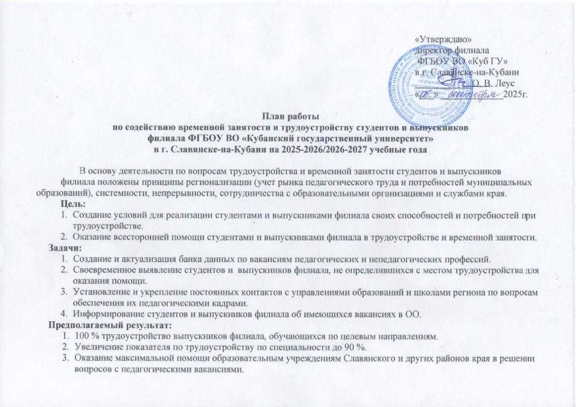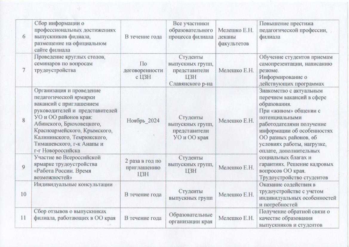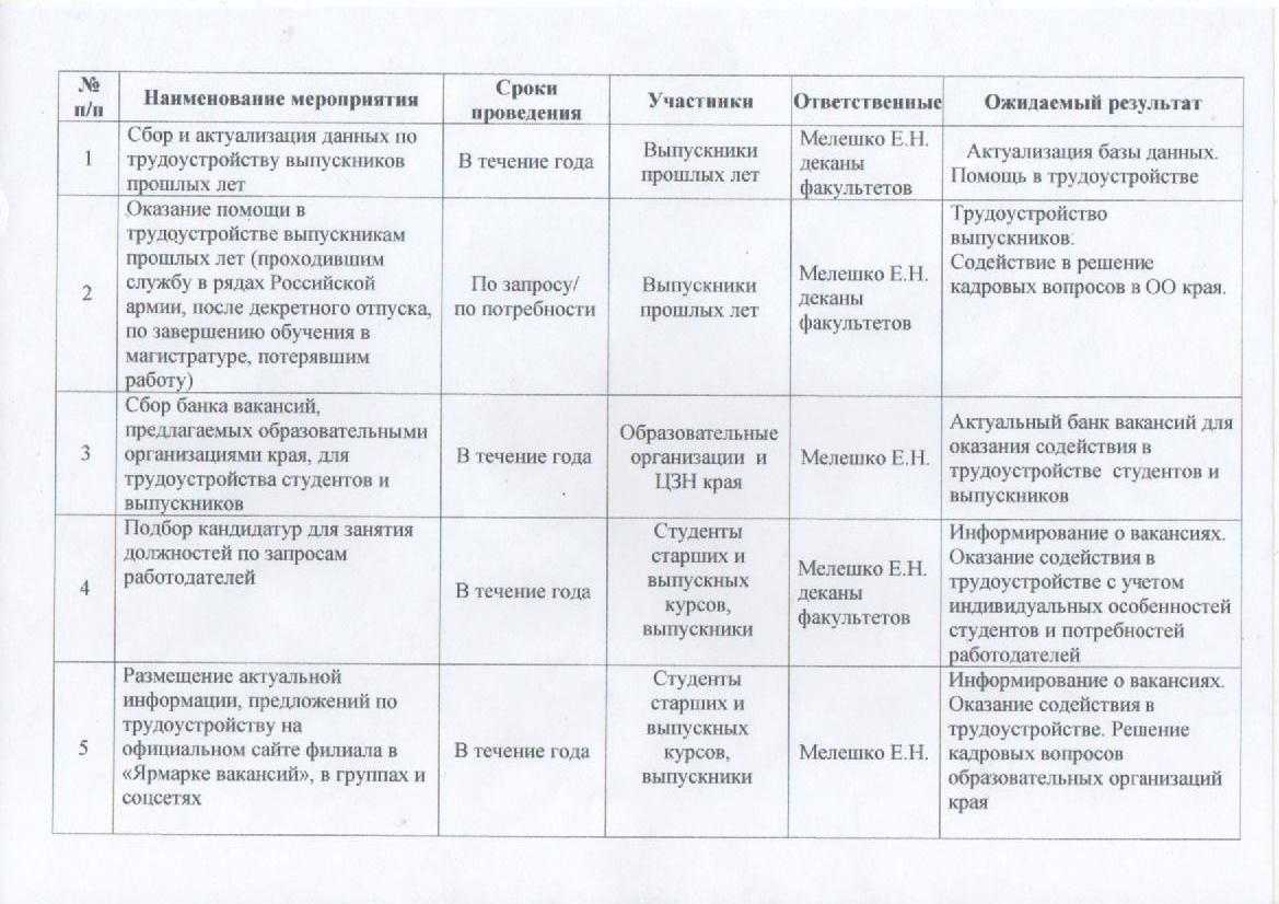 План работы филиала по вопросам трудоустройства и временной занятости студентов и выпускников